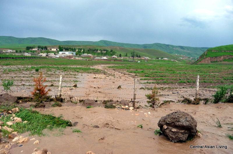Olimme odottaneet melkein yksi ja puoli tuntia. Keski-Aasian sateet ovat monesti rankkoja, mutta lyhyitä. Ja onneksi ei ollut kiire minnekään! Tien varressa kasvava ruoho näyttää veden kulkusuunnan. Vettä virtasi myös pelloilla ja ojissa.